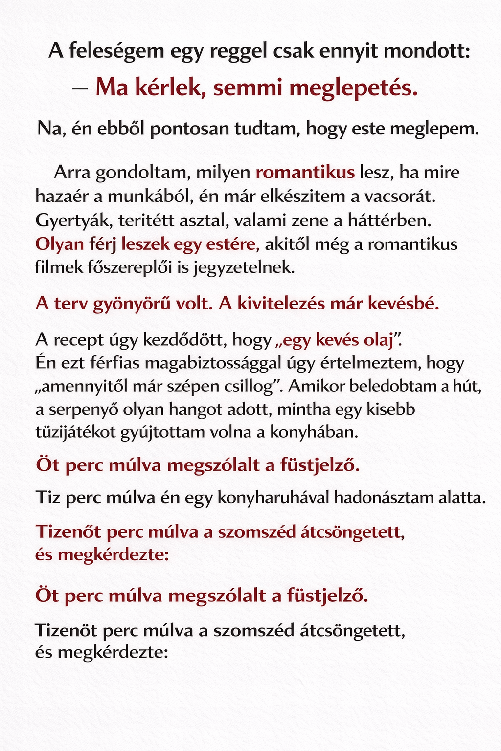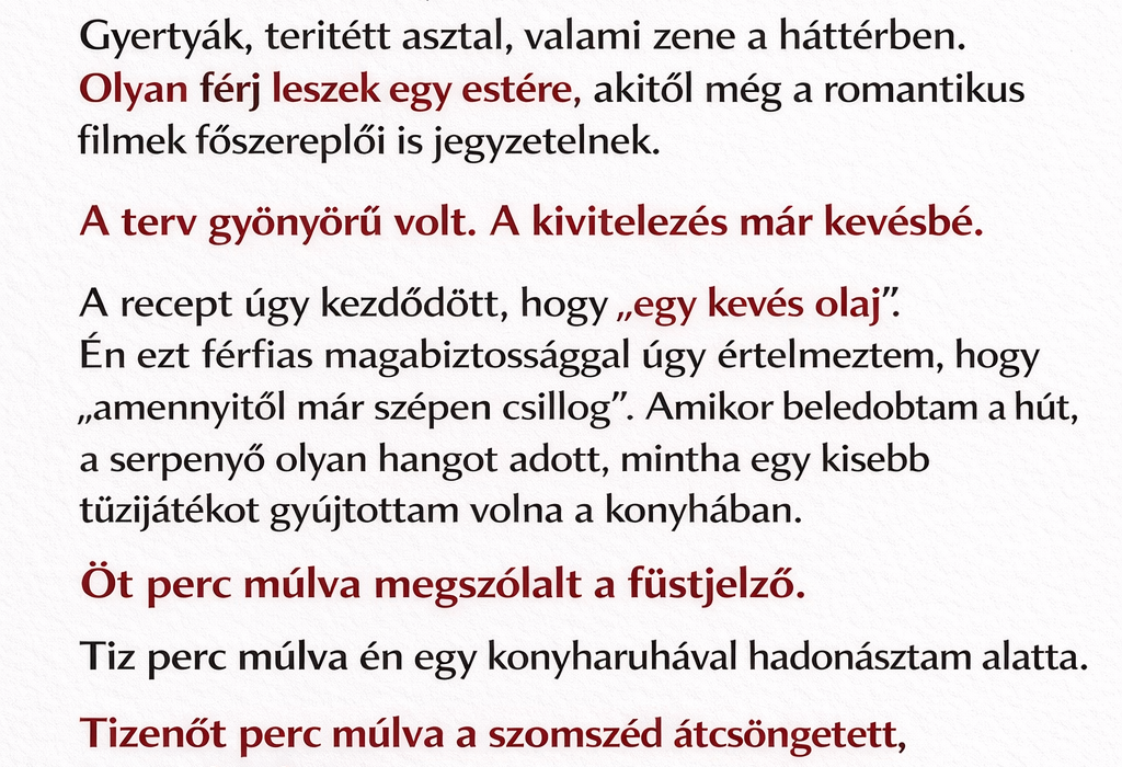 Végül rájöttem, hogy a vacsora menthetetlen. Gyorsan rendeltem pizzát, kiraktam a tányérokat, meggyújtottam két gyertyát, és úgy tettem, mintha az egész pontosan így lett volna kitalálva.