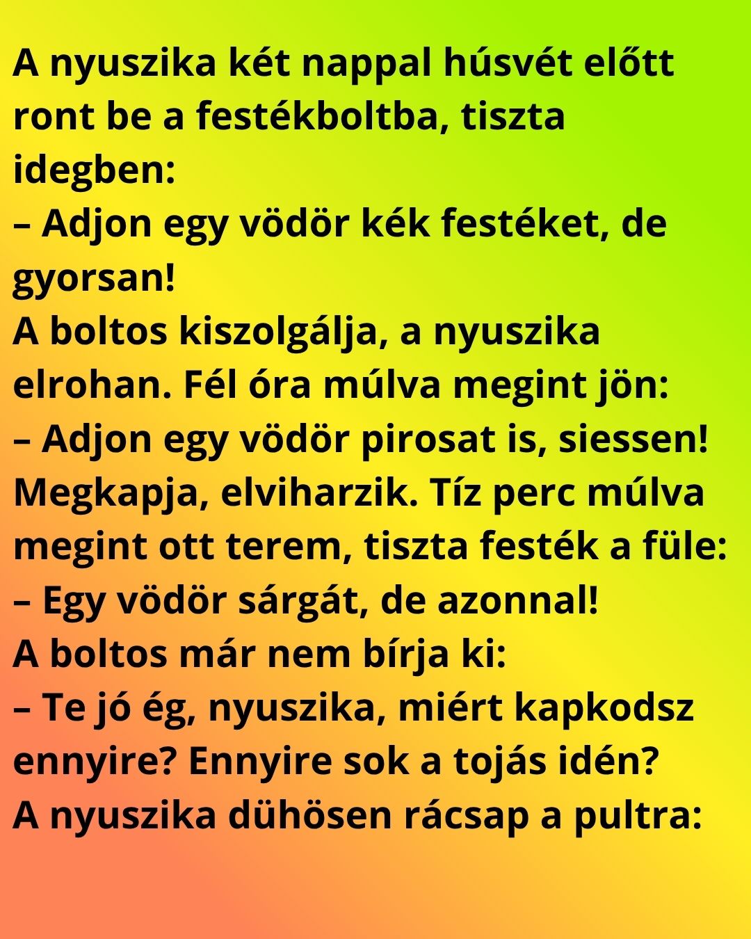 – Dehogy a tojás! A medve most vett egy fehér Mercedest, és azt mondta, ha húsvétig nem lesz színes, engem használ szivacsnak a mosáshoz!