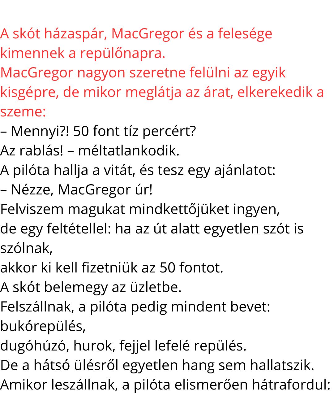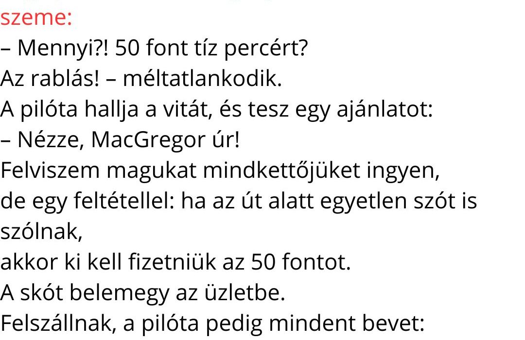 – Hát, őszintén szólva… amikor a feleségem kiesett a gépből a hurkolásnál, majdnem szóltam, de aztán eszembe jutott az az 50 font!