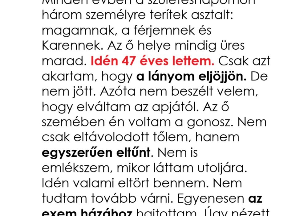A 47. születésnapom csendben telt. Három teríték az asztalon, egy üres szék, a lányom helye, akivel két éve nem beszéltem.