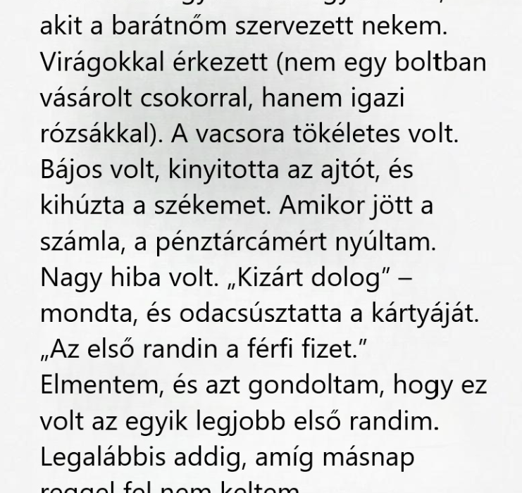 Nem tudtam, mire számítsak. Erik rózsával érkezett, és hozott egy apró ajándékot is, egy kulcstartót az első betűmmel. Vacsoránál kedves volt, figyelmes, és könnyű volt vele beszélgetni.
