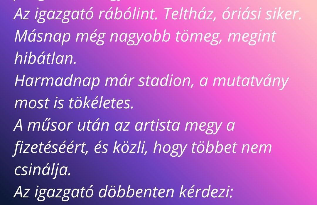 A műsor után az artista megy a fizetéséért, és közli, hogy többet nem csinálja.