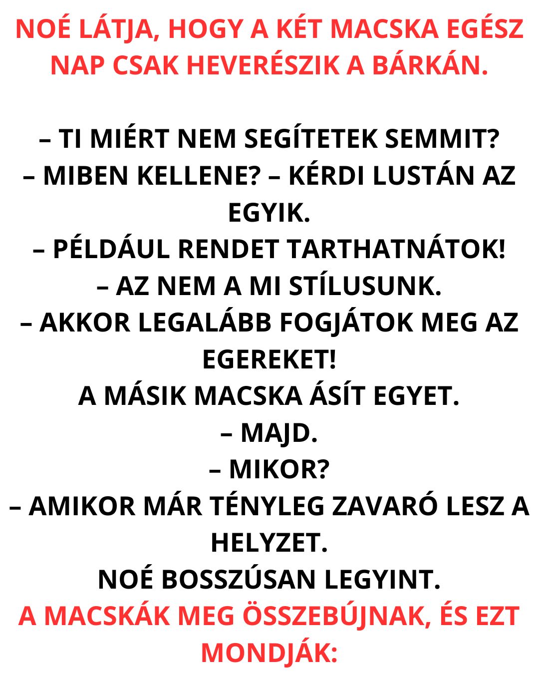 Noé látja, hogy a két macska egész nap csak heverészik a bárkán.