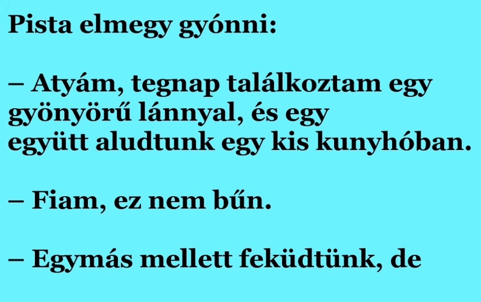 – Atyám, tegnap találkoztam egygyönyörű lánnyal, és egyegyütt aludtunk egy kis kunyhóban.