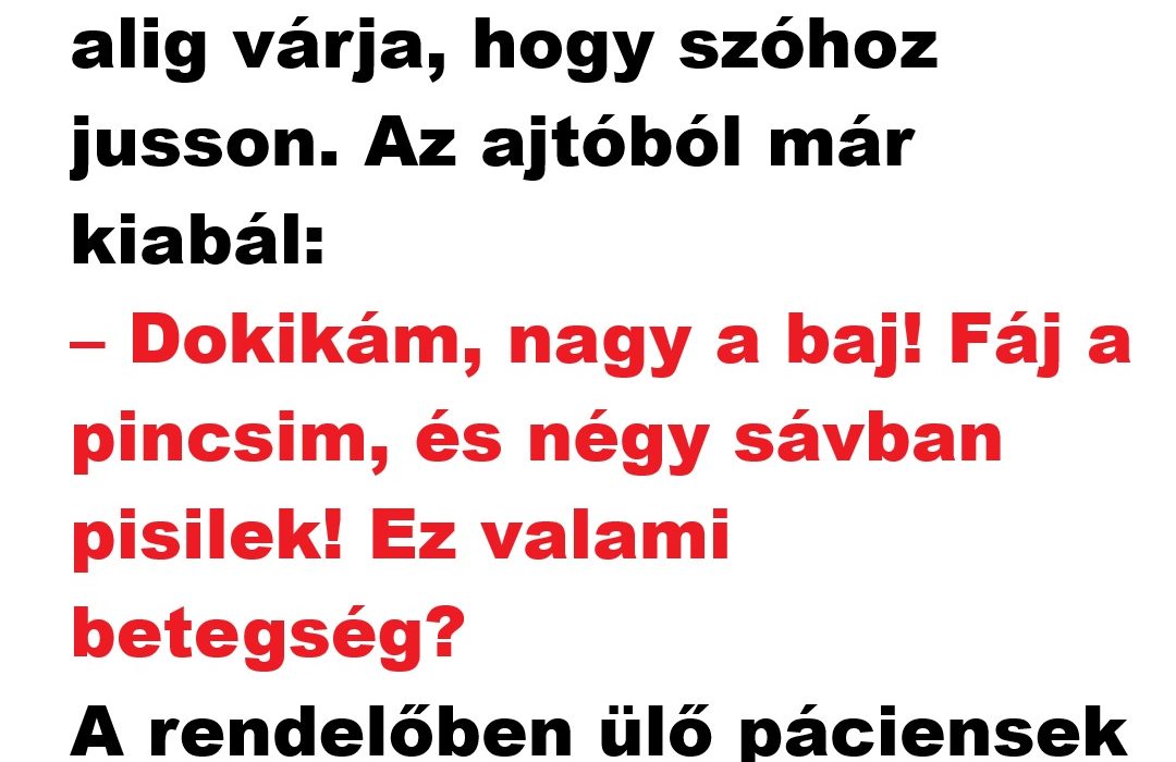 – Dokikám, nagy a baj! Fáj a pincsim, és négy sávban pisilek! Ez valami betegség?